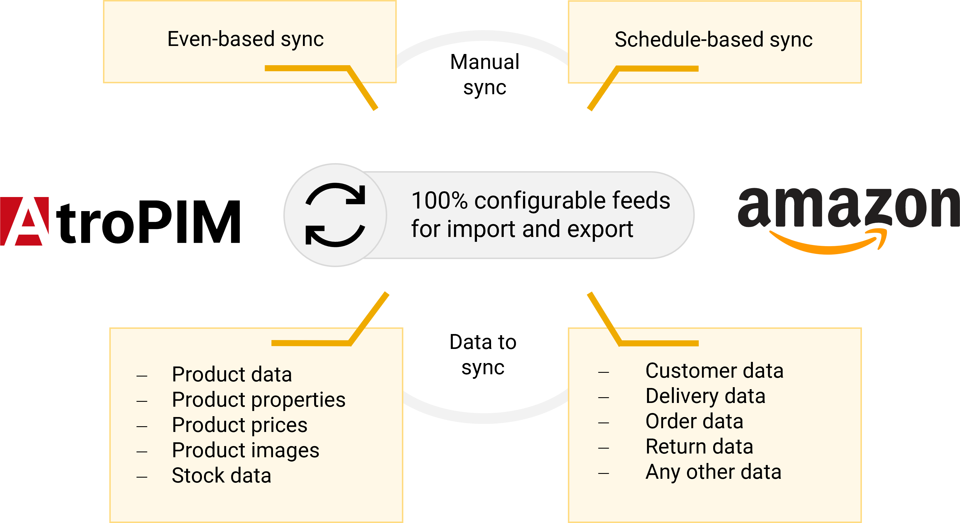 Synchronisieren Sie Produktinhalte automatisch von AtroPIM zu Amazon, oder gehen Sie weiter und verbinden Sie Ihr ERP für einen vollständigen bidirektionalen Datenfluss einschließlich Bestellungen und Lagerbestand